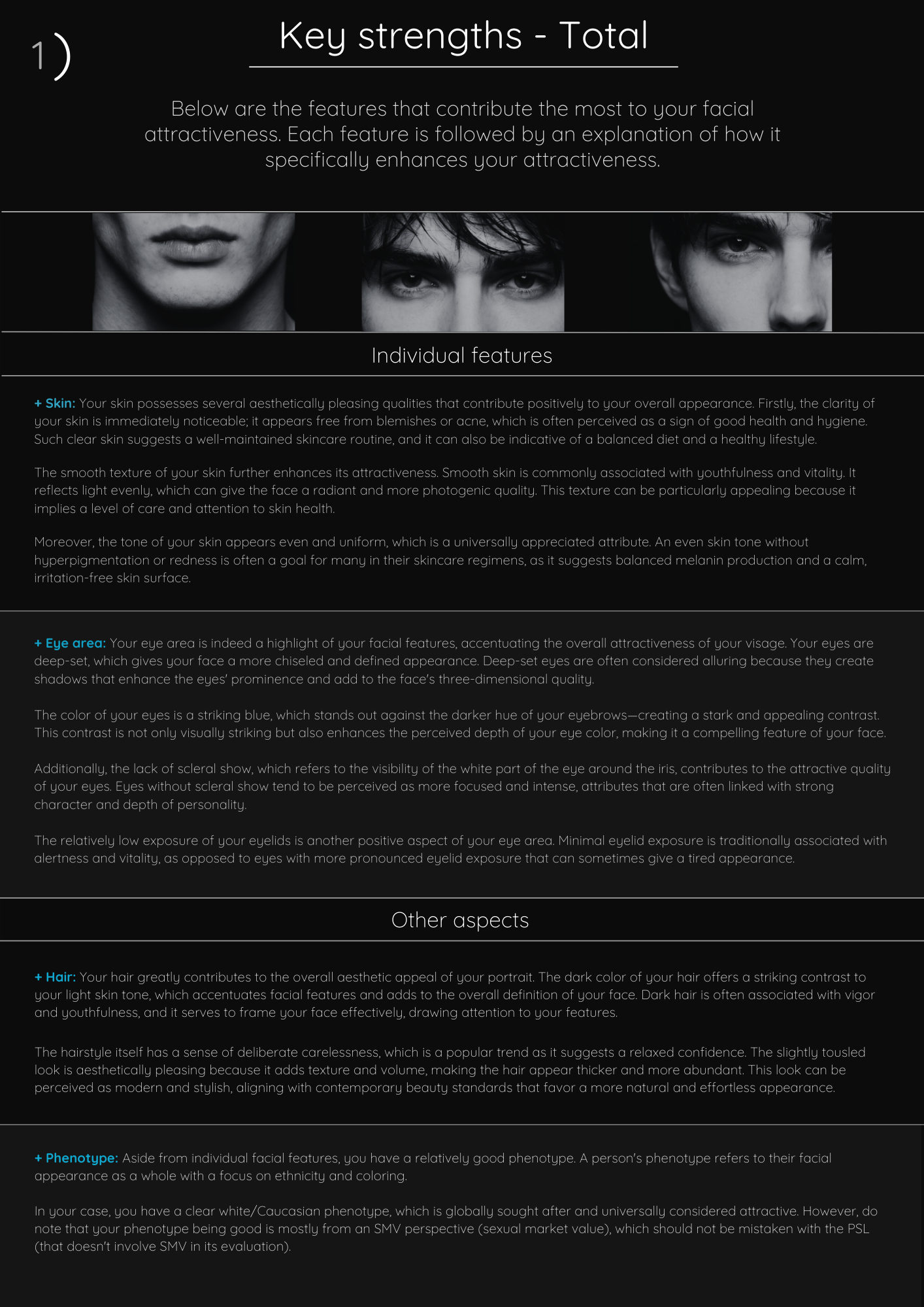 Get insights on your individual features, phenotype, ethnicity, best features, biggest improvement areas, and much more.