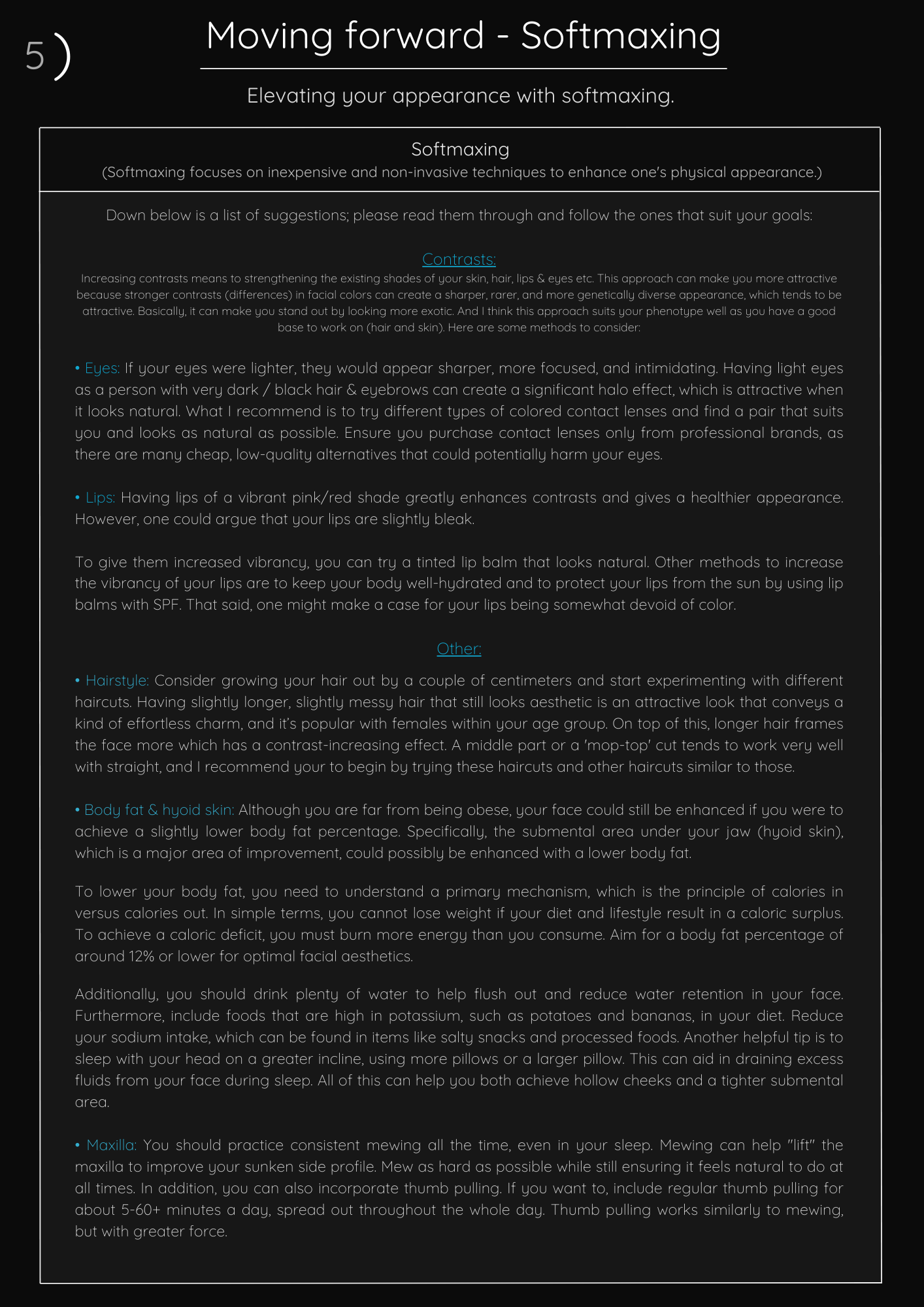 We work step by step as it’s the most effective approach. In month 1 we discuss how the first 1-2 targeted looksmaxes in your Action Plan went, ensuring we’re both on the same page before we move on to the next looksmaxes.
